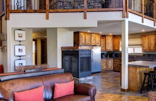 Fifteen minutes from Capitol Reef National Park, this unique and beautiful home has amazing views of the Red Cliffs of Thousand Lakes Mountain and the Bicknell Bottoms Wildlife Preserve. The 3300 sq. ft. cabin sleeps 9 in bedrooms, and another 2 downstairs on fold-out beds. The spacious three-level home offers a pool table, 3 indoor gas fireplaces, an outdoor propane fireplace, a horseshoe pit, and a trampoline. There are excellent views, sunsets, and bird-watching from the two large decks and patios.