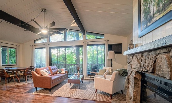 Leave the bustle behind for the whispering oaks and calming embrace of our renovated Laurel Highlands chalet. Enjoy grilling on the deck, sitting around the fire ring, watching wildlife in the woods, or reconnecting with friends and family inside the cozy chalet. Shrouded by towering oak trees, the chalet is quiet and feels secluded. Yet, it’s only minutes away from Ohiopyle, Seven Springs, Fallingwater, and other popular attractions in the Laurel Highlands.