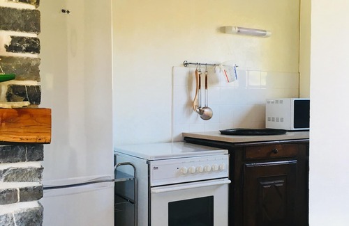 - a kitchen area: hob, electric oven, microwave, coffee maker, fridge