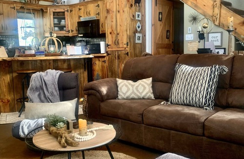 INTERIOR - The uniquely crafted cottage provides 1,225 square feet of comfort in an earthy-rustic interior setting for adult guests. The open floor plan bathes the cottage in natural light that showcases blue pine woodwork craftsmanship, reclaimed wood cabinetry, a split air unit for heating and AC options, soaring pine ceilings, and eclectic mix of boho and zen inspired decor. The cozy space offers guests two bedrooms, one bath with a river rock shower floor, a dining table, a coffee/breakfast bar looking out into the woods, a large kitchen island, and a third bedroom that serves as the tranquility room for meditation and relaxation. *interior propane fireplace not operational in summer