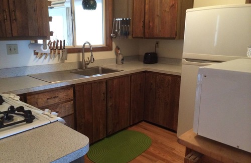 Kitchen has a full complement of dishware and cookware along with a standard coffee maker, Keurig coffee maker, microwave, toaster, electric griddle, Crock Pot, air popcorn popper, and base assortment of spices.