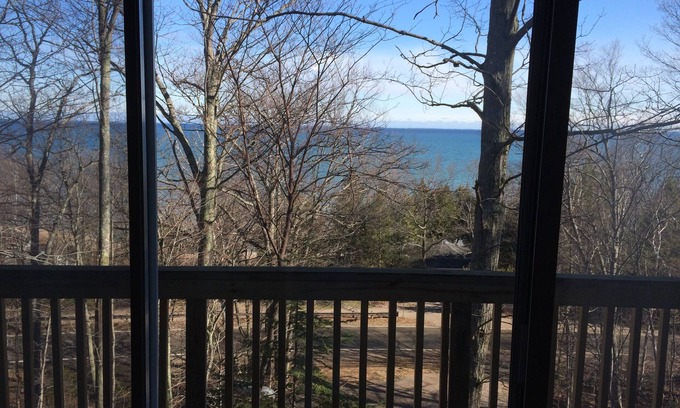 Secluded chalet-style cottage sits on bluff overlooking the Tunnel of Trees and Lake Michigan. Chalet sits on the non-lake side of the Tunnel of Trees, but has private beach access on the other side of street. Has one-plus acres of woods behind the cottage.