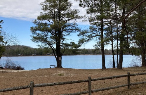 Includes sandy, shady private beach with shallow sandy bottom for kids and gentle drop to about 15 - 20 feet. Great for kids but still deep enough for adults. Gets warm in late summer.