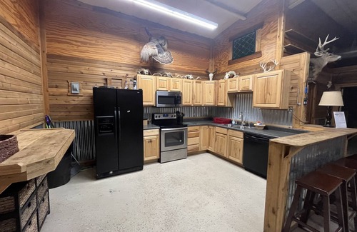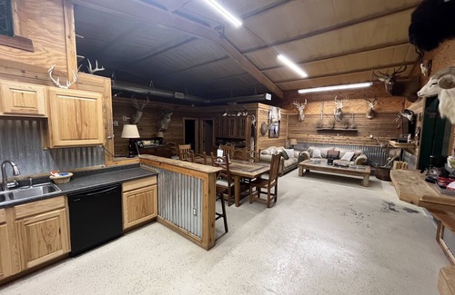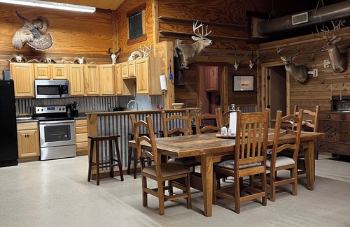 This facility is a comfortable lodge that can sleep up to 16 people. The lodge includes 3 full bedrooms, 2 full baths, bunk room that sleeps 10, 2 couches, large dining table, covered porch, outdoor grill, outdoor dining table, firepit, secure indoor storage, horseshoe pit, pool table, bar, and cornhole boards and bags. No discharging firearms, No fireworks, No smoking indoors.