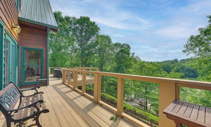 Look forward to easy living at this family-friendly lakefront vacation rental in the Appalachian foothills! The 5-bedroom, 5.5-bath house offers Tallapoosa River views. The 2-story boat dock is perfect for swimming, lounging, fishing, kayaking, and paddleboarding. Enjoy hiking, relaxing in the hot tub, making s'mores by the fire pit, playing pinball and pool, or watching a movie by the cozy fire.