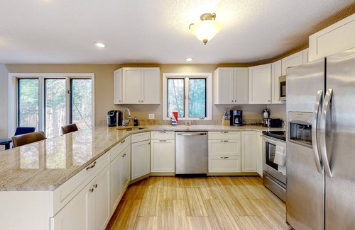 Enjoy the peace and serenity of the woods at this multi-level home tucked away in a quiet neighborhood near Webber Pond. The location is secluded enough to avoid the hustle and bustle; however, you are still close to many attractions. Pick your own fruit at Pietree Orchard, open from June to October, while skiing at Pleasant Mountain (formerly Shawnee Peak). Downtown Bridgton, Fryeburg, and North Conway are also short distances away.