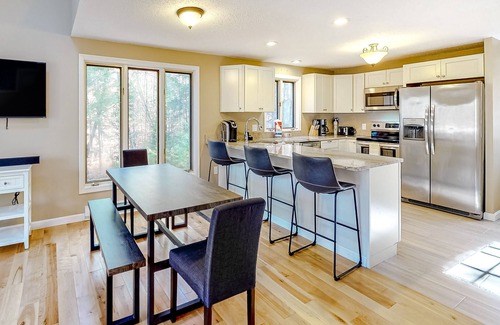 The inviting living room features vaulted ceilings, a wood stove with a river rock wall behind it, comfortable sofas, and a TV with a sound dock. This is the ultimate gathering spot for binge-watching shows and movies! Sliding glass doors lead you to the furnished deck with a private hot tub. Another tremendous outdoor spot is the propane firepit with patio chairs around it. Back inside, the fully-appointed kitchen and its great appliances will help your creativity flow to prepare delicious homemade meals for everyone. A gas grill is also available if you want to step it up a notch! When it comes to entertainment, you'll find a TV and sofas downstairs. Additional amenities include a washer/dryer and Satellite Internet.