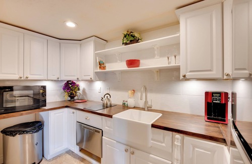 KITCHENETTE: Well-equipped w/ 2 burner stove, convection oven, drip coffee maker, dishware & flatware
