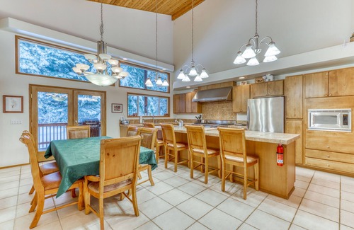 During the winter, this home is a winter wonderland, and during the summer, an outdoor enthusiasts dream! With two suites, two bedrooms, and an open great room, this home is perfect for entertaining any group. The full kitchen has a large island, two sinks, and all the tools you'll need to dine in with ease. In the living room, the large picture windows allow you to bring the outdoors in watching the sun peeking through the trees. Grab a morning cup of coffee and watch the snowfall or elk graze! After a day's adventure, grab some hot cocoa and gather together for a movie or board game as you talk about the day's adventure.
