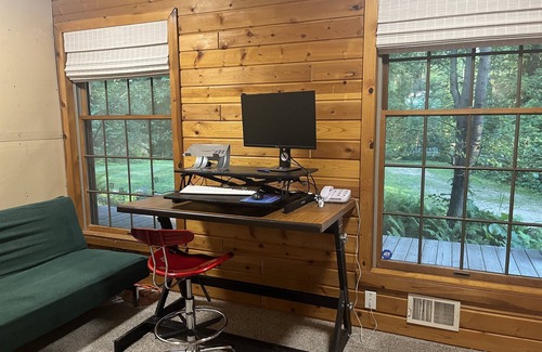 OFFICE: Need to stay connected with the office? We have two work areas where you can plug in to a monitor and keyboard with USB or USB-C hookups. Our private office on the first floor has a laptop stand and sit/stand desk overlooking the front porch. A futon in this room offers another sleeping area (note that the office is on the first floor but the bathrooms are upstairs).