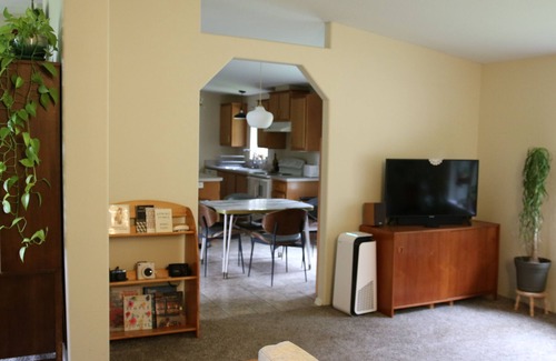 Peaceful light-filled home with great views of pond, and forest close to town with access to state parks, fresh-oysters, & drive-in theatre.