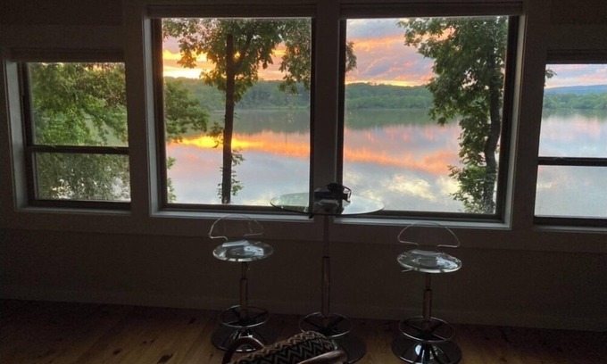 About our listing: A meticulously kept two story lakefront with beautiful views of lake, mountain, and sunset. Includes fishing dock, canoe, paddle boat, kayak and outdoor seating with fire pit. Enter from either 1st or 2nd story. Upstairs is one 20x25 bedroom/ sitting room with wall of windows facing lake. It has one king size bed, two swivel rockers, leather easy chair, coffee bar alcove with 2 stools and table, 40" TV, electric fireplace, closet and armoire. Flooring is lovely antique pine board.