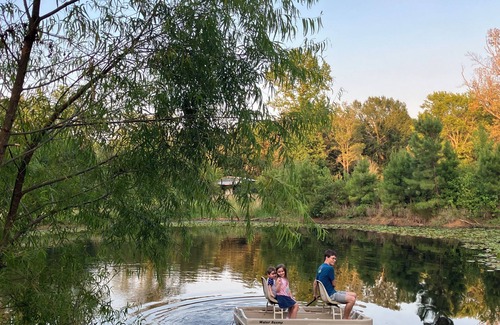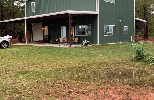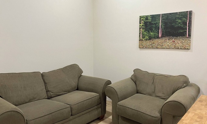 Cozy mother-in-law apartment over the garage for a quiet getaway (accessible only by stairs). Bedroom has king-size bed with tempurpedic mattress, blackout curtains, and a walk-in closet. Main area has sofa & armchair, TV, and kitchenette with island eating area. 8 acre property includes a pond with fishing, walking trails, and lots of nature!