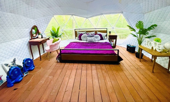 Stay the night at this gorgeous dome close to breathtaking waterfalls. You can see the fireflies at night and hear the beautiful sound of the rain while lying in a comfy king-sized bed. There’s also a fire pit for your enjoyment!
