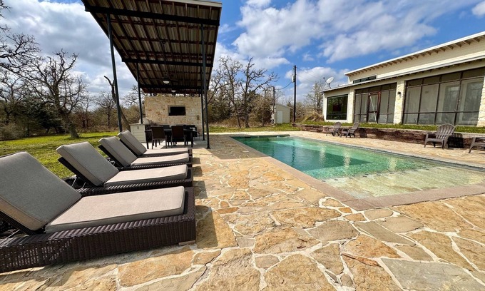 This gorgeous home is set on 42 acres and is located 6 miles from Round Top Square. The modern floor plan is open in the common areas and has a pool, summer kitchen with grill, a pond, and a screened porch that spans the back of the house. This picture-perfect property's prime location is great for enjoying local shopping, music, festivals/events or enjoying the quiet solitude of the country. Whether traveling with family, friends or girls trip, this home can be your own idyllic hideaway.