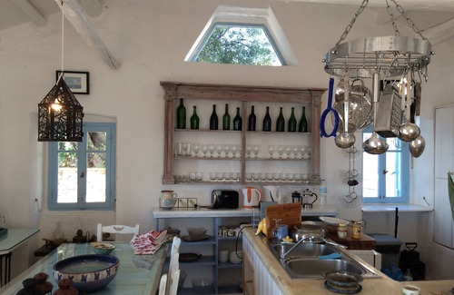 Over 200 years old, Xyloporta is a group of small one storey cottages allowing each guest their own entrance and terrace area. One cottage has an upper storey with a Juliet balcony looking out to sea. Recently renovated last year, the cottages have modern, minimalistic interiors but each one is individual in size and shape, which adds interest and variety. Based roughly around the central, shaded courtyard and olive tree, the central living, eating, cooking "house" is generous in its proportions, has two picture windows that can be fully opened allowing for a window seat looking over the pool and a balcony looking out to sea. The kitchen is open plan and designed for use by large parties. The sitting area is generous, with two three seater sofas and two armchairs around a coffee table, with a large fireplace (perfect for winter evenings). There is a large terrace, half shadowed by the pergola; beyond is the pool with its infinity-edge dropping down into the olive groves below. There is also a smaller, shaded, pool for children, shallow enough for little ones to splash in safety. The property is secluded and peaceful, at the end of a quiet track. Surrounded on two sides by olive groves, there is also a landscaped garden area which is being developed by the owner. It has wifi, air conditioning, two baths and showers en suite in every bathroom. Xyloporta is equally lovely in the spring and the autumn, as well as high summer. There are beautiful walks into the hills and around the coast, cycling routes to explore and simple tavernas to enjoy.
