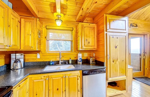 As soon as you enter this rustic charmer, you will be greeted by a beautiful and bright open floor plan with high cathedral ceilings, exposed wood beams, and floor-to-ceiling windows flooding the space with natural light. Read a favorite book, play any of the provided board games, or plan your next adventures with your loved ones. The kitchen is fully equipped with all the essentials to prepare delicious homemade meals for everyone. Attached to the main living area is a beautiful sunroom, which comes in handy after a terrific day exploring all the nearby amenities. If you are in need of cooling down, take a refreshing dip in your private heated pool. When the sun sets, make sure to throw some logs into the wood-burning firepit for an entertaining storytelling session while roasting s'mores. Back at the home, the downstairs level enjoys a welcoming rec area with a smart TV and a desk and a laundry room with a washer/dryer.