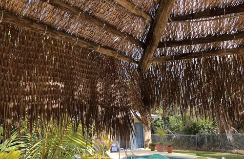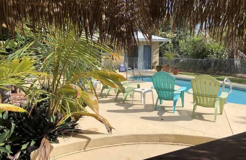 This is truly a "secluded hideaway" Very private backyard with pool facing the canal. Small Tiki hut to enjoy a bit of shade.