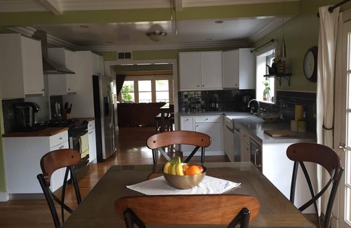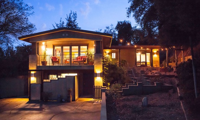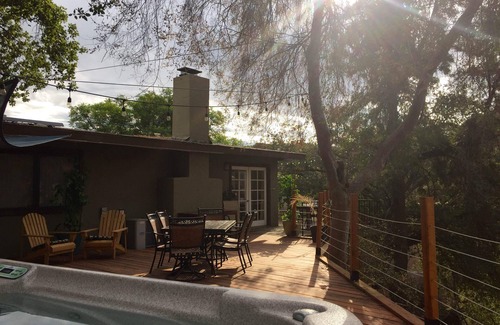 Our home in the hills above Pomona boasts incredible sunrise views & hundreds of square feet of outdoor decks and patios surrounding the house. Minutes from Fairplex at Pomona, parks, golf courses & the Claremont Colleges, it's nestled above it all in a quiet canyon. The house has a large living and family room complete with leather couches, large fireplaces and televisions, and two spacious bedrooms—one Cal King bed and two twin beds. Decks and patios surround the house on three sides, as do the countless trees lining the hillside. The house features a fully stocked kitchen, laundry, 8-person spa and all the comforts of home. A dining room, breakfast nook and several outdoor decks provide plenty of table seating both indoors and out, affording you a perfectly relaxing getaway.