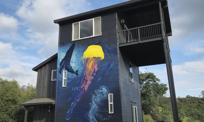 Looking to escape the bustling noise of everyday life and immersing yourself in a tranquil sanctuary? If so, welcome to your own private hilltop! Imagine a captivating getaway in the form of a private lookout tower, perched exclusively on a scenic hilltop. Surrounded by the Sierra Foothills and 360 views, this secluded retreat offers a unique opportunity to indulge in serene solitude and breathtaking vistas. The absence of light pollution is perfect for admiring and capturing the Milky Way. Renowned muralist Camer1SF recently painted an oceanscape that will uplift your soul.