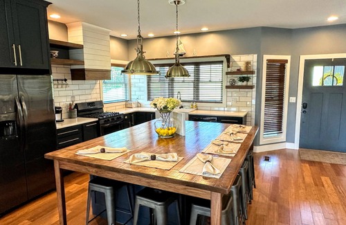 This gorgeous property features a fully stocked kitchen, four bedrooms including two king beds, a queen bed, bunk beds, and a charming daybed with trundle, along with three full baths for added convenience. Enjoy leisurely evenings around the back yard fire pit or host barbecues with the gas grill at your disposal. For entertainment, the basement boasts foosball, arcade games, and a treasure trove of board games—perfect for both young ones and adults alike. With ample outdoor space to explore, you'll find hiking trails and picturesque landscapes right in your backyard, ideal for those romantic moments or group photos on your wedding day.