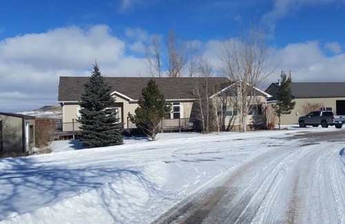 Private, secluded, spacious home on a ridge line with gorgeous views of the Wind River mountains, fishing on the Popo Agie River, and abundant wildlife--only 10 minutes to downtown Lander and close to so many activities and attractions in WY! 3 bedrooms, 2 baths in the main house, with an additional bathroom in the garage office (available seasonally from mid-May through September), master suite, 2 living areas, modern kitchen, large wrap-around deck, basement that includes game room and theater system. It's REALLY more than just OK in our home in Lander, Wyoming!