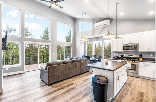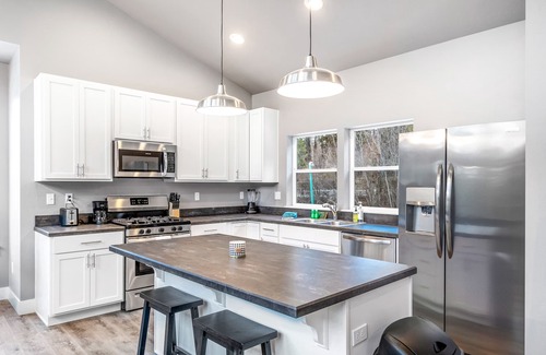 The private hot tub provides guests with the ultimate relaxation spot after a day of skiing or a day out on the lake and taking in the beauty of surrounding nature. The large deck off of the living room is a great place to relax and enjoy the views - barbecues here are a hit among guests. The basement is set up either as a hangout spot for the kids or a quiet office to get work done. The kitchen and living room is a large open space to congregate during meals and there are two full bathrooms for convenience. There is also internet service and a strong cell signal in the house along with three smart TVs.