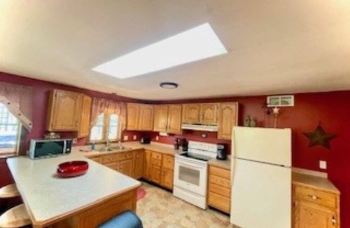 Come stay with Timberline Cabins! Hillside Hideaway Lodge is a secluded house built into the earth near Atwood Lake in Magnolia, Ohio. This property is perfect for up to 10 guests. It features two bedrooms - one with a queen bed and a single bed, and the other has one queen bed, single and queen sleeper sofas, and 2 camping cots. The property offers a fully equipped kitchen that is open to the living room. There is additional seating in the sunroom. With more than 13 acres, you will enjoy seeing wildlife tucked away from the rest of the world - SUPER PRIVATE! There is a fishing pond on the property and room to park your boats for Atwood Lake.
