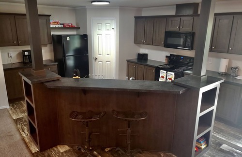 Open concept house where dining, livingroom and kitchen keeps the family connected and entertained by our 70 inch smart TV. Sleeps 6 comfortably with the possibility of 2 more guests, provided queen air mattress. Two full baths as well as a washer and dryer on premises. Stepping out through the patio door you will be greeted by our generous deck stocked with sun umbrella, 6 sitting patio set, and four burner grill.