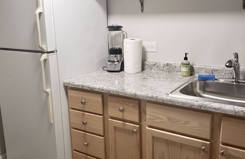 A small kitchenette conveniently located closer to the campfire to grab a drink out from the fridge and prepare meals for outdoor cooking is available at the small utility building next to the pile of cut wood.