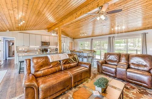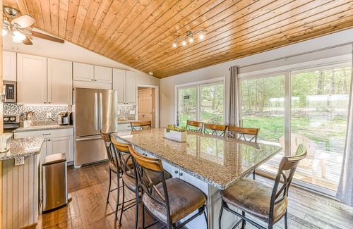Find yourself tucked amongst the beauty of Central Virginia and make yourself at home at this lakefront gem. As soon as you step foot inside, you will be greeted by rustic touches of raw wood on the tall ceilings, plenty of natural light filling the entire space, and an open layout that will allow everyone to mingle and spread out. Step out to the expansive back deck and you will find stunning views of the lake and surrounding foliage, a gas grill to enjoy cookouts in the fresh air, and plenty of seating for dining al fresco! Walk down the wooded path to the shore of the lake and sit on the private dock while you soak your feet in the cool waters of Lake Anna. Inside, the chef of the group will fall in love with the fully equipped kitchen boasting beautiful countertops, a fun backsplash, breakfast bar seating for reminiscing while prepping ingredients, and all of the utensils needed for any recipe. Plus, the living room and dining area will be ideal for gathering together for movie nights or formal meals!