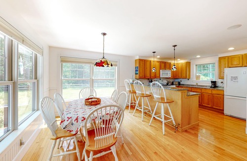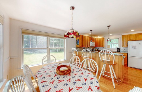 Take in unobstructed water views from every window inside the homey living space, detailed with sweet country touches throughout. Hardwood floors, a wood stove, and comfortable furnishings help create a warm, cozy feeling no matter the time of year. The well-equipped kitchen features all the appliances, counter space, and gadgets you’ll need to whip up a feast, and the group can dine together at the window-front table or pull up a barstool at the kitchen island to keep it casual. Spend the evenings gathered in front of the wood stove while you stream your favorite shows or use the in-home, high-speed WiFi to upload the day’s pics to social media. Relax with some music courtesy of the sound system with speakers in every room or, if you’ve got any remote work to do, a sweet roll-top desk offers the perfect perch. Three comfortable bedrooms await at the end of your first – and every – perfect vacation day.