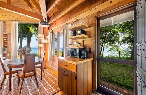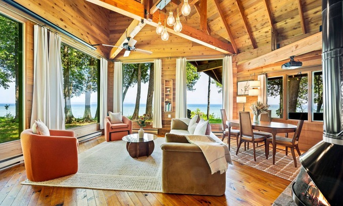 Surrounded by woods and crystal clear water, Nordcliff Cottage is a minimalist retreat perched above Lake Michigan, with sweeping views of Washington, Plum, and Pilot Islands. Built in the 1960s, and equipped with modern furnishings and decor, this Scandinavian-inspired cottage offers a serene, calming space where natural light floods the open loft, inviting relaxation and connection with the tranquil lakeside setting. A sand beach with public access is just steps away.