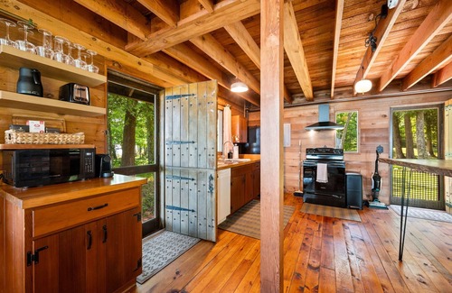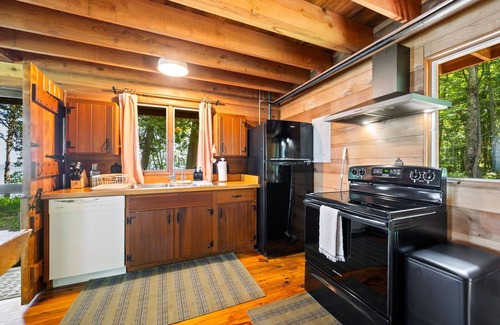Nordcliff Cottage blends original mid-century details with a clean, modern aesthetic. Inside, you’ll find warm woodwork, a striking wood fireplace, and vintage bathroom fixtures that preserve the spirit of the original build. The open, minimalist layout features a lofted sleeping area that comfortably sleeps up to four. The kitchen includes modern appliances, dishes, and utensils for easy meal prep.