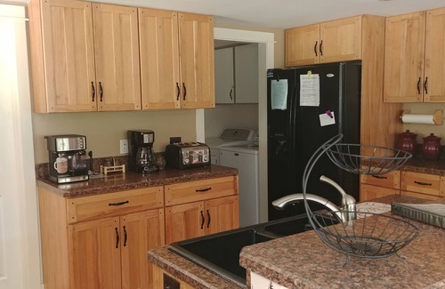 The master bedroom has a queen-sized bed and two more can sleep in the trundle bed, while two guest rooms have a queen, & two singles respectively. There is a full pull-out sofa in the den/living room, and a futon in the finished basement. The wood stove is backed up by a conventional furnace, and there's a room downstairs for stowing away skis & hiking gear.