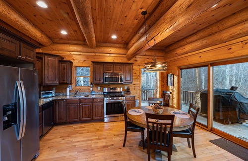 Stepping inside, you will quickly understand why this is one of the most popular cabins in the area. The spacious great room features cathedral ceilings with a full wall of chalet style glass windows, which bathe the cabin?s rich exposed log beams in daytime sunlight. In front of a massive stone fireplace are comfortable leather sofas with plush throws, ready for you to curl up with a good book or to settle in to watch your favorite movie. The chef-inspired kitchen is stocked with everything you need to create gourmet delights. The cabinets are filled with everything from spices to specialty culinary tools, including high end cookware, a mixer, waffle iron, and even an ice cream maker. The kitchen features a modern gas range with convection oven, as well as a dishwasher. Located just off the great room is the spacious master bedroom with a king bed, set with luxurious bedding. The bedroom is highlighted by the elegant wall mounted gas fireplace, perfect to warm yourself by after a late night soak in the spa -- found just outside the bedroom?s doors. The main level also features a full bath with luxury linens and amenities, as well as a utility room with available washer and dryer. If you must log in to your work email while away, a desk and chair are located in a nook beside the staircase, and the cabin is connected with WiFi internet.