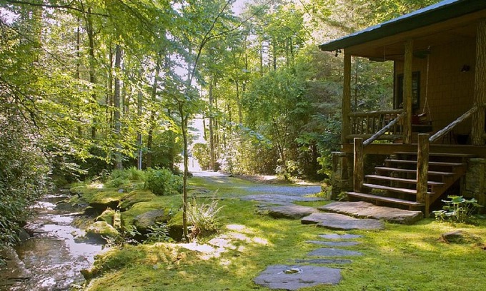 Our luxury and secluded waterfall cabin is nestled just 25 feet from a beautiful waterfall with a private stream coming within 10 feet of the master bedroom. Our secluded cabin is located in the North Carolina Blue Ridge Mountains just 12 miles from Brevard and 1/2 mile off a paved road. A true mountain cabin retreat surrounded by pristine forest and bordered on two sides by an 8000-acre private preserve. Just a stone's throw away is a roomy front porch where solitude and relaxation begin while settling down in a rocker or listening to the calming waterfall or the rain hitting the tin roof.