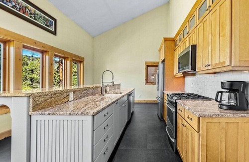 The gourmet kitchen has stainless steel appliances. The main living space and master bedroom feature 55 inch flat screen TV's with 5.1 surround sound. The leather couch in the main living space converts to an incredibly comfortable and supportive queen bed. The large covered porch is a great place for lounging and watching the sun disappear over the mountains in the evening. The house is surrounded front and back with Colorado Rocky Mountain Wildflowers.