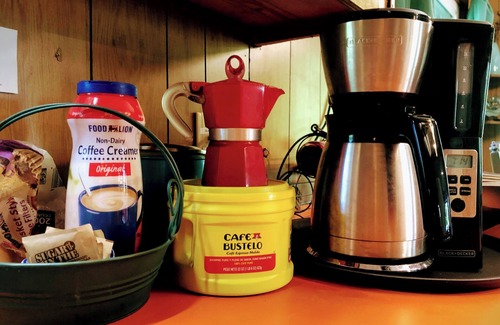 The kitchen has everything you’ll need to prepare meals, from cookware to spices, condiments, and coffee. Appliances include an air fryer, microwave, panini press, drip coffee maker, and stovetop espresso maker.