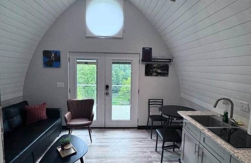 Inside, you’ll find a thoughtfully designed arched cabin with a queen-sized bed, cozy sofa sitting area, and a private bathroom featuring a glass-doored shower. Special touches—like soft linens, plush towels, and makeup-removal cloths—make your stay feel both comfortable and carefree.