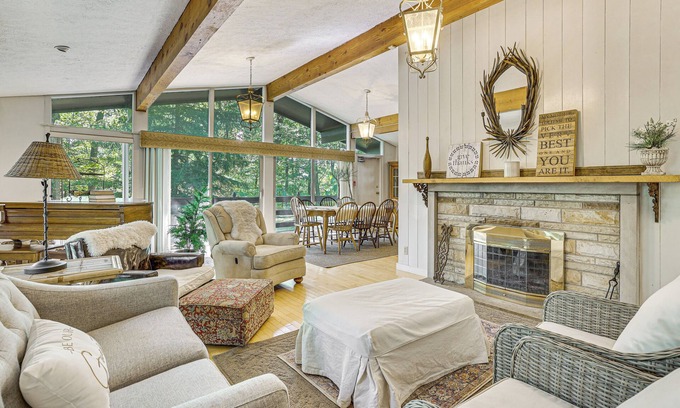 Retreat to Amish Country and relax at ‘Blue Forest Lodge,’ a New Philadelphia vacation rental! Nestled within a peaceful wooded landscape, this 4-bedroom, 3-bath home invites you to unwind and reconnect with nature. Spend days discovering the rich heritage of Schrock’s Heritage Village or perfecting your swing at a nearby golf course. As the sun sets, gather around the fire pit and take in the scenery.