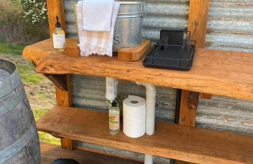 An outdoor kitchen adds to the experience, offering a fully equipped space to prepare meals al fresco. Whether you're brewing a morning coffee as the mist lifts off the land, or preparing a romantic dinner as the sun sets, the kitchen is designed for comfort & ease. With a camp stove, utensils & an open-air dining area, you can enjoy cooking while being completely immersed in nature.