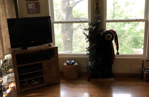 ASK ABOUT LONG TERM WINTER RATES! Nice Clean Country Cabin --Air Conditioned-- 2 Bedroom (1King Bed - 1 Queen Bed). Each bedroom is one step down from the Dining Room. It is a down hill slope down on the sidewalk to the Cabin. All Linens Are Furnished, Always Clean Beds Guaranteed, 1 Small Bath (shower only), Kitchen, Dining Room, Living Room That Overlooks The Woods & A Creek (sometimes dry), The Kitchen Is Fully Equipped With A Full Size Refrigerator, 50's Style Stove, Toaster Oven, Dishwasher, Microwave, Toaster, Coffee Pot, Blender etc. The Living Room Has A Sofa, 2 New Lazy Boy Recliners, A 40 inch High Definition Flat Panel TV and DVD Player. There is free WIFI in the Cabin. There Is A Full Size Washer and Dryer, Covered Deck With A Gas Grill, A Pond To Fish In, Outdoor Fire Pit By The Swing. Located Between 2 Public Hunting Areas, Secluded, Very Nice Peaceful Setting In The Woods.