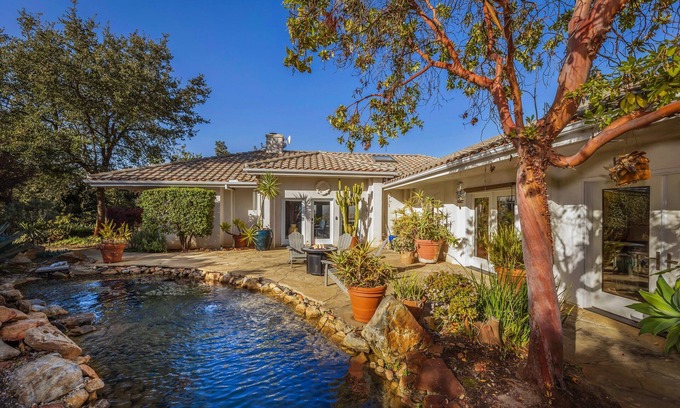 Mirar Oasis Resort is a north San Diego County private estate on a 5 acre commercial Avocado grove. Saltwater pool & spa. Heavily stocked home with all the conveniences you'd expect as if you were in your own home. Views are one-of-a-kind & expansive. Sleeps 10 comfortably, 1-story. Wrap around stone patio & outdoor dining area. Fast Wi-Fi. Unique vegetation and fruit trees. Pond & waterfall, and firepit. Large family room w/ 8ft pool table, corn hole & games along w/85 inch TV, 5:1 Surround Sound & PS4 & PS4 games. Minutes to Escondido restaurants, breweries, wineries, casinos, hiking, beaches, Zoo Safari Park and Legoland!