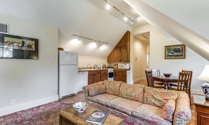 Enjoy the relaxation of dining in your own apartment with a living area, full kitchen and dining area. This historic inn has a beautiful private patio, with access to a secluded garden, complete with outdoor lap pool and heated spa. This upstairs apartment has 2 bedrooms and 2 baths, and accommodates up to 6 total guests. Each bedroom has a queen bed and an additional twin platform bed. Lovely antique decor will enhance this getaway. Whether you are on a romantic getaway or have a small reunion, our Carriage House near the Riverwalk is sure to please. Our base rate pricing assumes 2 guests will share each queen bed. If there are 2 guests in bedroom but one wants to use use the twin bed and not share, there is a $10 per day extra bed fee to make up or use the twin bed. If the guest is a 3rd guest and has paid the extra guest fee, the twin bed fee is included in that extra guest fee.