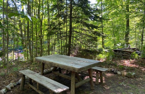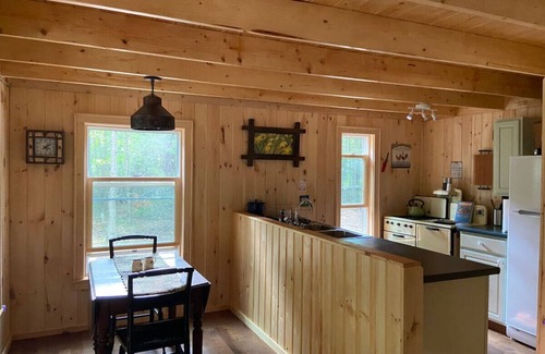 A full kitchen is complimented by a propane stove and fridge. Furnishings and decor are rustic Adirondack style. Simple and elegant! There is a Japanese soaking tub with hand shower in the bathroom. Enjoy a hot bath with the sounds of the rushing river and surrounding forest.