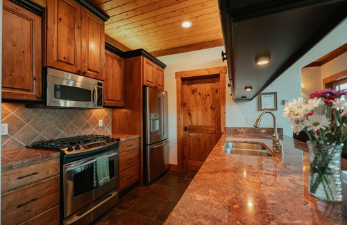 *Completely equipped designer stainless steel kitchen with dual fuel range. French door refrigerator, microwave, and dishwasher and knotty alder cabinetry.