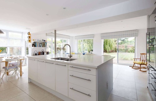 The open plan kitchen flows into a beautiful dining space with window seating, and a living area with a huge corner sofa to sink into. Choose your spot to sit and unwind with a coffee, good book or glass of wine.