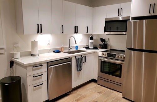 The Sonder Suite offers modern amenities to ensure your stay is both comfortable and memorable. Featuring a full kitchen, bathroom with contemporary finishes, and cozy accommodations with one queen bed and a couch, this 700-square-foot getaway becomes your home away from home. Should your guest list grow, an air mattress is available upon request for an additional fee. Enjoy two designated parking spots and the convenience of on-site hosts to assist with any needs during your stay.