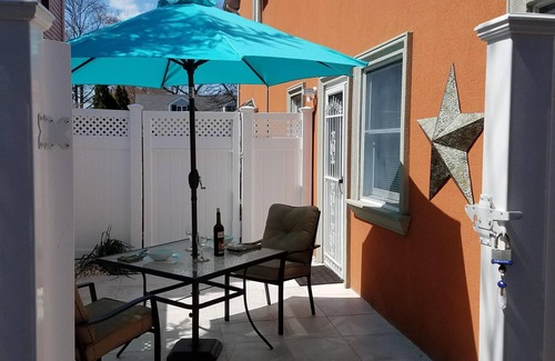 Our studio is ideal for those seeking privacy and tranquility. Relax without the crowds and hassle of hotels. Our sunny first-floor studio features high ceilings, a full kitchen and a cozy ambiance. During warmer months, enjoy a meal sitting under an umbrella in your private, fenced-in, porcelain tile patio. Couples, solo travelers, outdoor enthusiasts, LGBT and business travelers will find a home away from home. Free WiFi included!